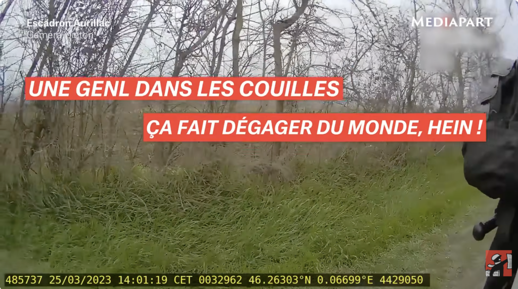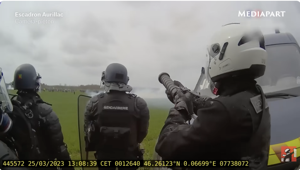 En mars 2023, à Sainte-Soline, dans les Deux-Sèvres, une manifestation écologiste contre un projet de mégabassines, pourtant interdite par la préfecture, rassemble plusieurs milliers de personnes. La mobilisation dégénère en violents affrontements avec les forces de l’ordre et fait état d’environ 200 blessés, dont 40 graves. En novembre 2025, Mediapart, en collaboration avec Libération, publie des vidéos inédites issues des caméras-piétons de gendarme présents le 25 mars 2023. Ces images révèlent des tirs de grenades lacrymogènes et explosives en tir tendu, pourtant prohibés, ainsi que des ordres explicites et un langage guerrier, venant contredire la version officielle des forces de l’ordre.