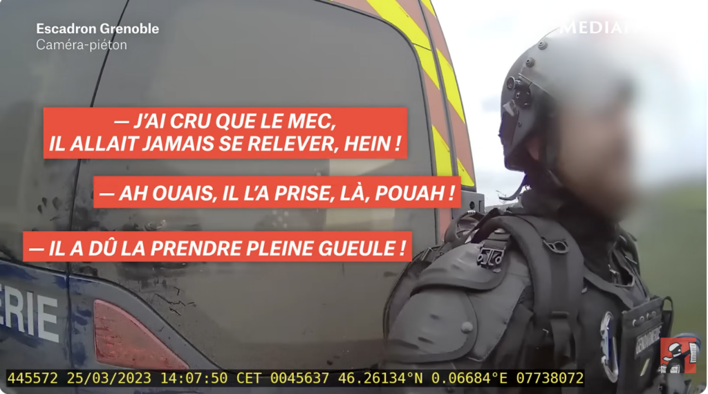 Il y a la source des images et les personnes qui nous permettent de diffuser ces informations. Par rapport à la diffusion des informations, nous, on est très carré. Vous avez vu, je ne vous n’avez pas donné d’explication. On donne juste le contexte de captation et d’exploitation de ces images-là. Donc, en aucun cas, on ne va livrer l’identité ou les identités des personnes qui nous ont aidées à récupérer ces images. Ça, c’est vraiment important. Et puis, la transmission des informations est très sécurisée. Et deuxièmement, sur l’anonymat des victimes, on a respecté l’anonymat des victimes qui ne souhaitent pas transmettre leur identité. On est resté collés à leur volonté de transmettre ou non leur nom, leur prénom. On a utilisé un pseudo quand c’était nécessaire pour certaines victimes. Après, sur le recoupage des informations, les images des gendarmes provenaient toutes des caméras des gendarmes eux-mêmes. La provenance des informations était “mono-source” si on peut dire. Alors ce qu’on a du faire consistait à recouper les caméras les unes avec les autres, pour essayer de comprendre ce qu’il s’était passé à un moment donné. On avait beaucoup de “sources images” qui étaient présentes à un même moment, à un même endroit, donc ça a été un travail quasi chronologique de pouvoir comprendre ce qui avait pu arriver à un certain moment. Mais on a surtout fait la différence entre les gens qui étaient très exposés aux violences et d’autres qui étaient des gendarmes peut-être plus éloignés. Donc on a peut-être appliqué un peu plus de « sévérité » à l’idée de l’exploitation de certains escadrons, qui ont tenu des propos ou commis des actes qui étaient extrêmement violents alors qu’ils n’étaient vraiment pas en première ligne. On a essayé de faire la part des choses, parce que c’est vrai que des mots insultants ou des violences verbales peuvent être plus compréhensibles pour des personnes en première ligne par rapport à certaines qui sont arrivées après et qui n’ont pas pris cher comme d’autres escadrons. Mais en tout cas, on est sûrs de nos images. C’est-à-dire qu’elles étaient photographiées par les gendarmes eux-mêmes. C’était clair que c’était leurs images, c’était leurs propos qui se sont enregistrés.