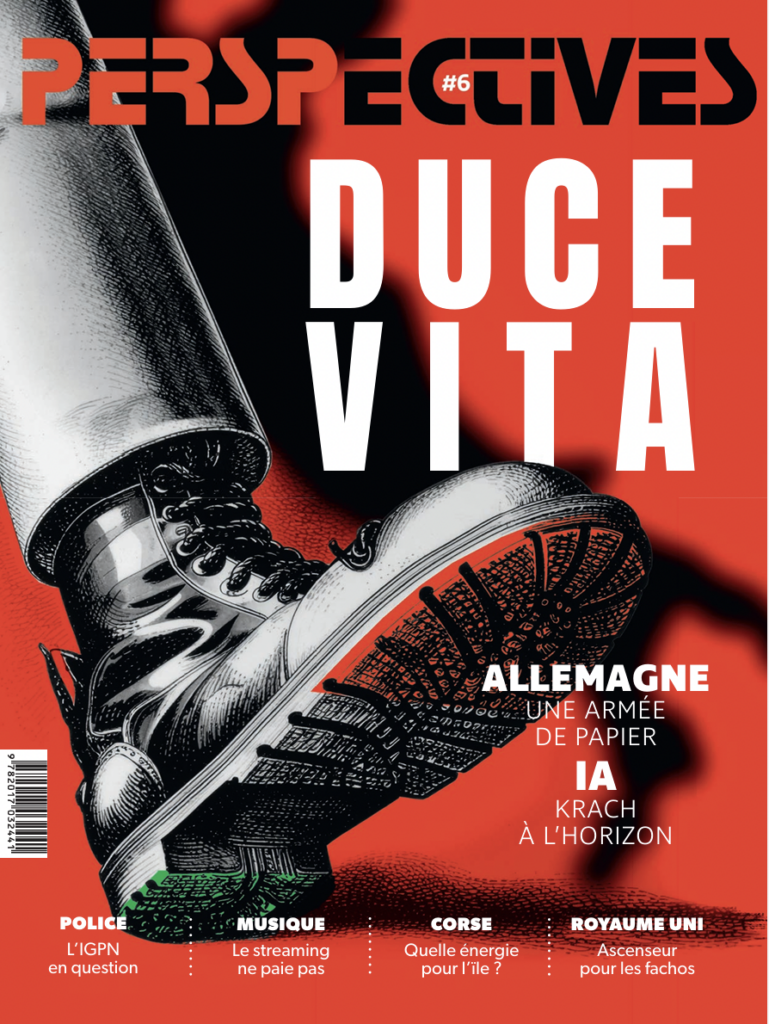 Au sommaire de ce sixième numéro de Perspectives, une enquête sur le cas Meloni et le caméléon derrière la dirigeante italienne, l’armée allemande, la montée de l’extrême-droite en Angleterre, un dossier sur les oligarques de la tech, l’IA qui affole les marchés et laisse planer la possibilité d’une bulle, un point sur la commission d’enquête de la neutralité, du fonctionnement et du financement de l’audiovisuel public, un autre sur les réseaux sociaux et les mineurs, un dossier sur la rémunération des musiciens et les astuces des petites fermes pour survivre. Bonne année !